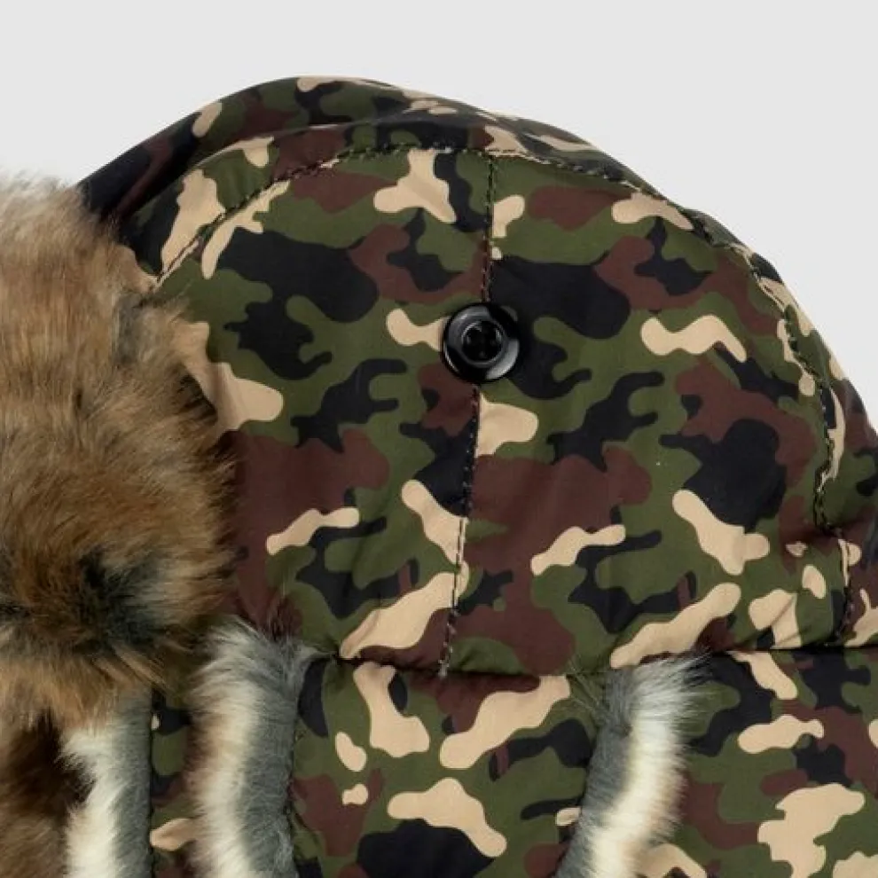Keep their head and ears nice and toasty with this cozy with this stylish trapper hat. Featuring Tightly woven canvas exterior with soft faux-fur trim, faux-fur lined earflaps, adjustable chin strap, and quilted lining.