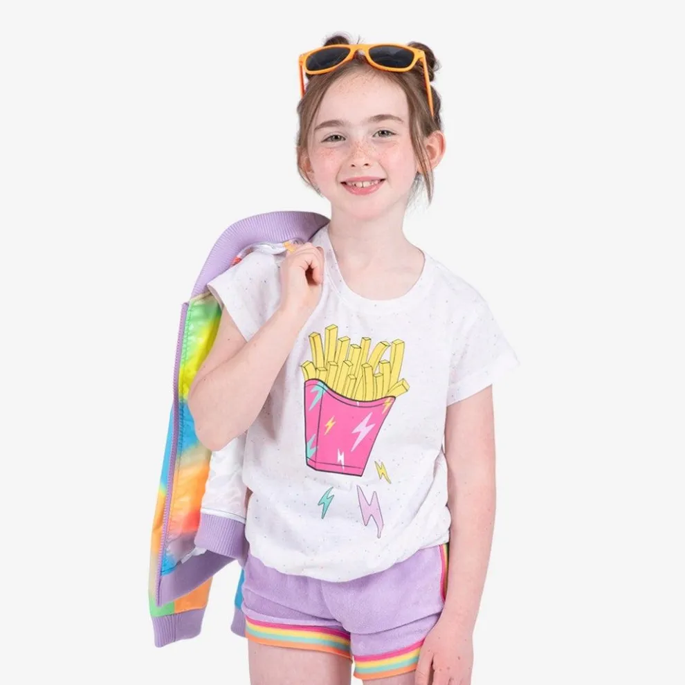 Sprinkle some fun into your little one’s wardrobe with Appaman’s Speckled White Callaway Tee – because who said tees can’t be a blast? Featuring playful multicolored speckles and lightning bolts. The star of the show? A large fry for your small fry, turning this tee into a delightful style treat.