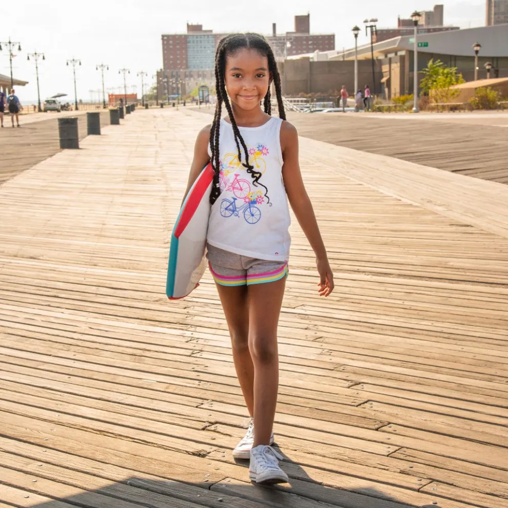 Our favorite hi-lo print tank, with a bright bicycle print, is the perfect top for warm weather! Featuring an open back detail and a flow fit, your little one is sure to stay cool!?