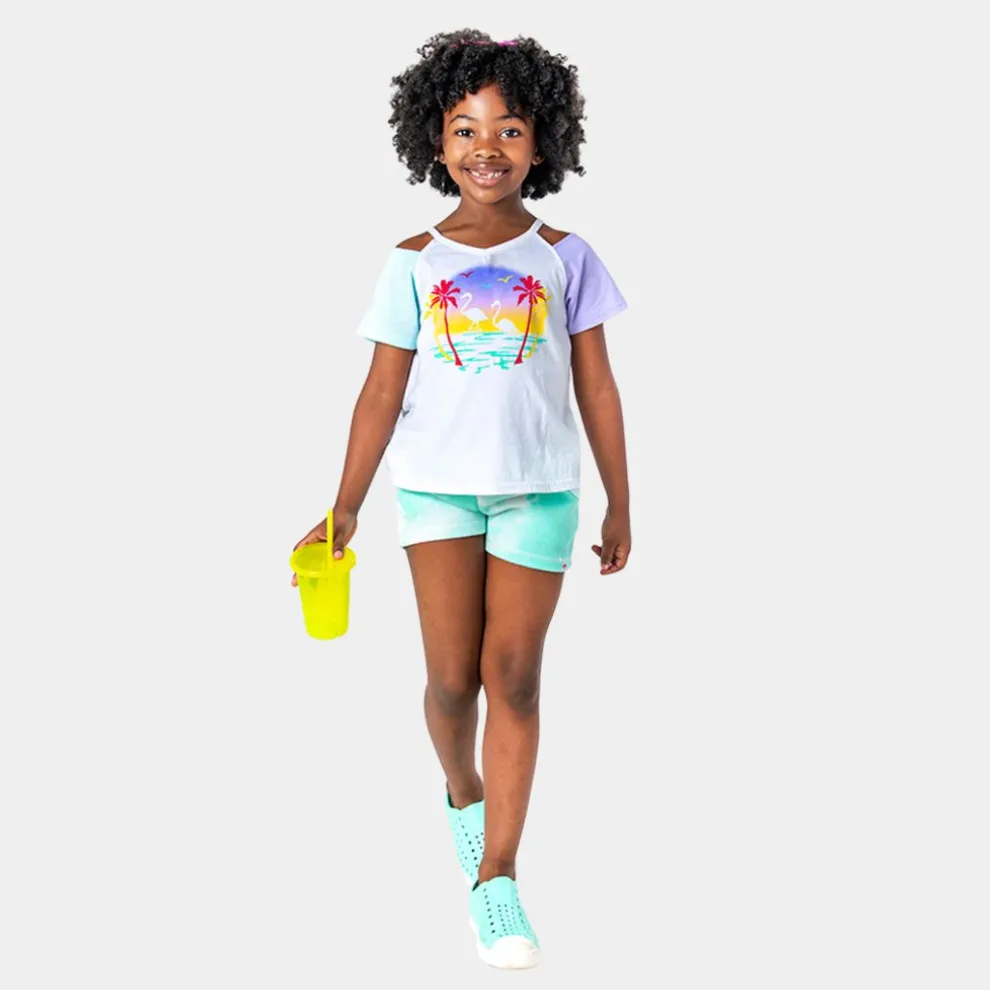 Sunsets and silhouettes. The perfect summer tee is finally here. With unique tank and sleeve cuts, this Kari Tee features a stunning sunset graphic with flamingos and palms galore.