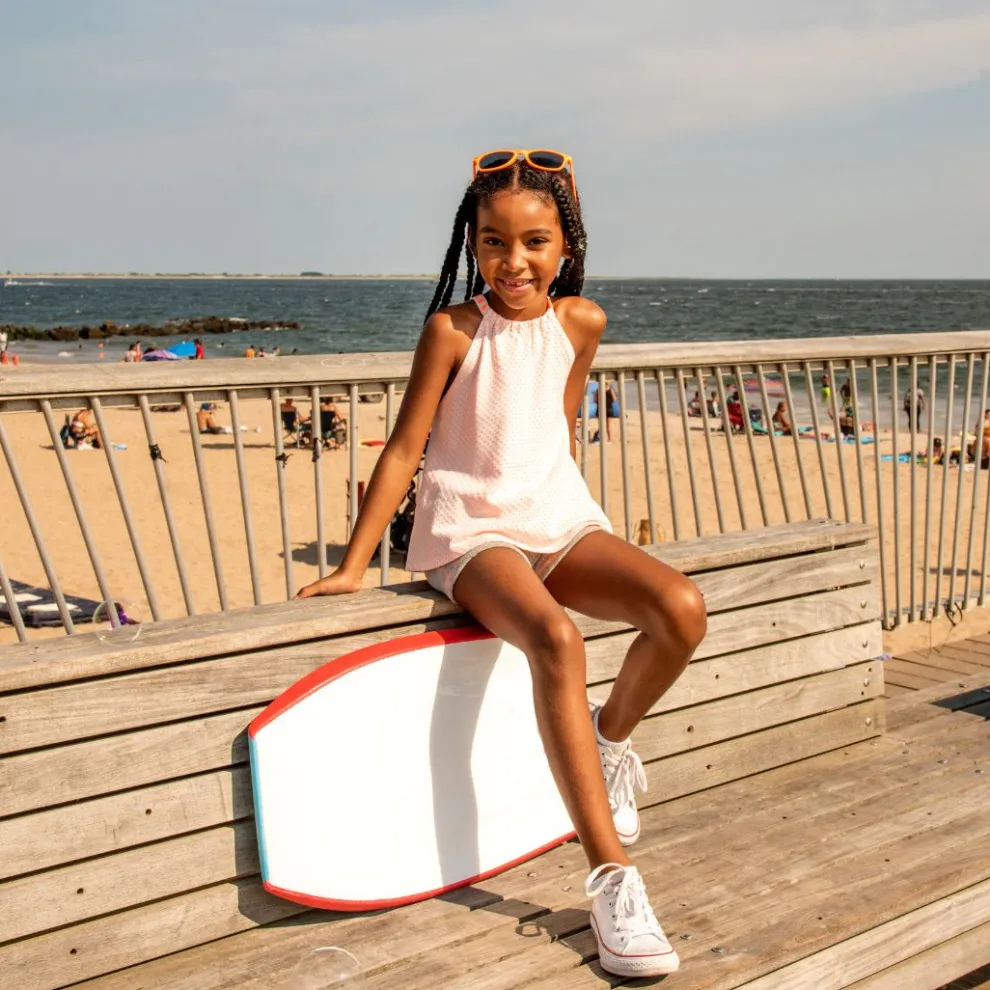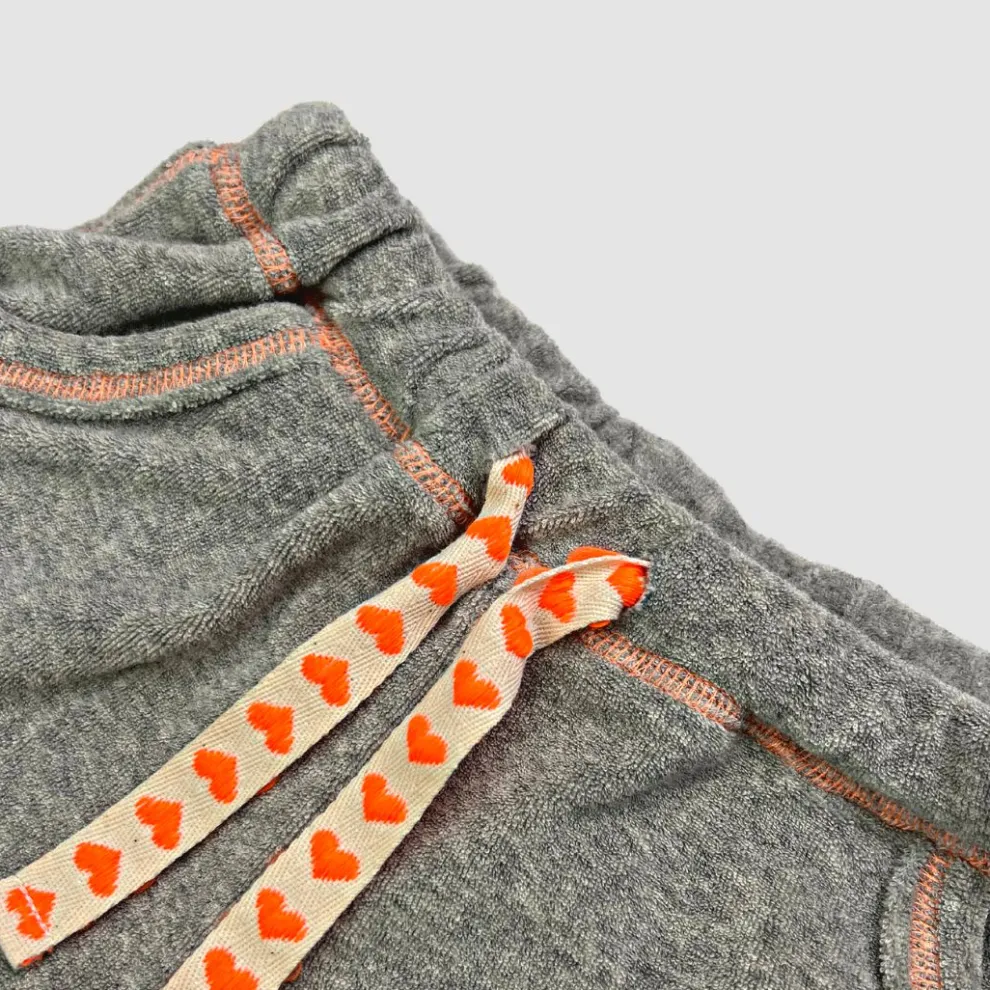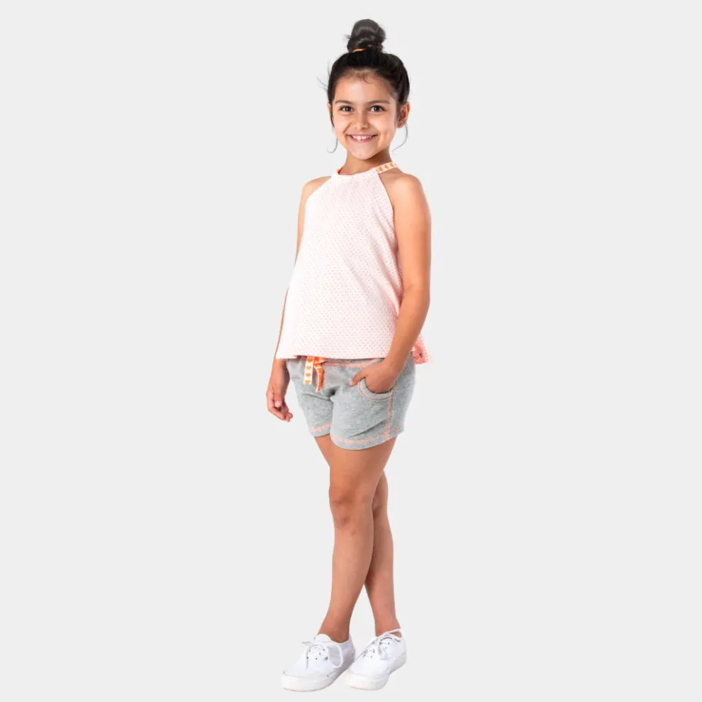These Grey Majorca Shorts with orange heart straps and detail are perfect for summer camp, school, or any occasion this summer. Pair these pocketed shorts with our Sanibel Tank in Novelty Dots for a matching summer fit!