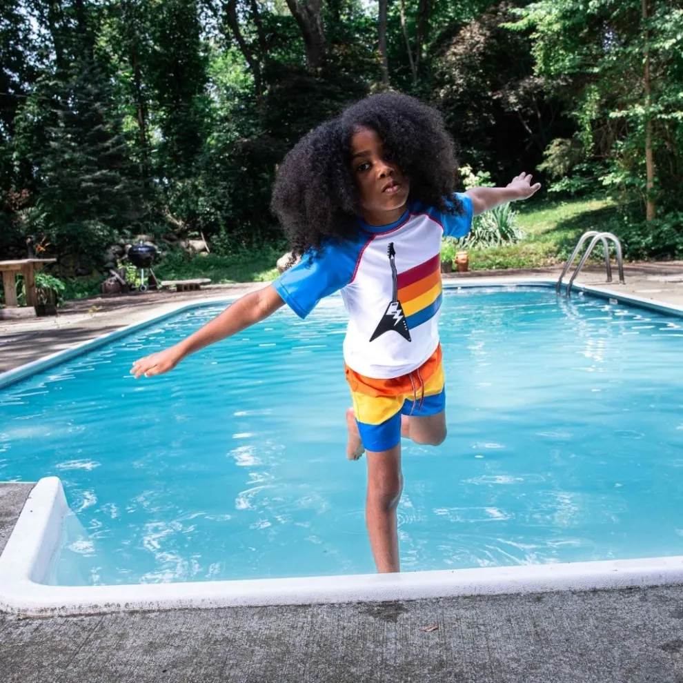 Introducing the Royal Blue Guitar Rash Guard – where sun protection meets rock ‘n’ roll by the pool! Made with UPF 50 protection, it keeps your mini rockstars safe while they shred the waves. With its cool white body, sleek black sleeves, and epic guitar graphic, this swim top is ready to rock your kiddo’s swim style.