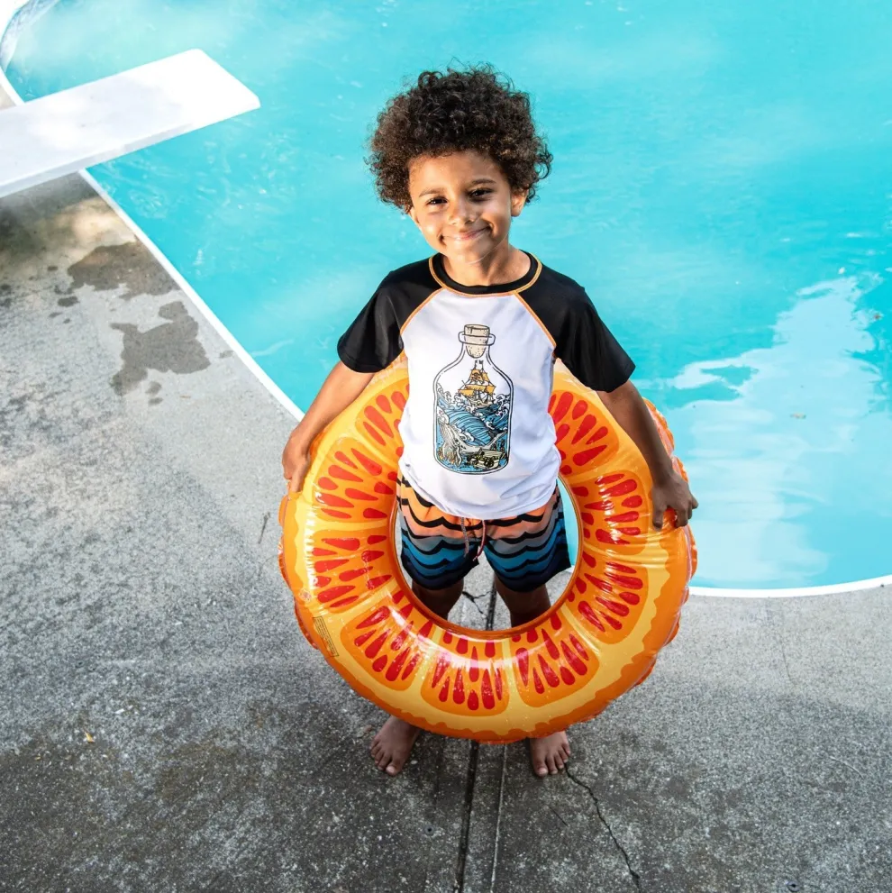 Introducing Appaman’s Boys’ Swim Rash Guard – Sail into style with our ship-in-a-bottle design. Ride the wavy waves in UPF 50+ protection.