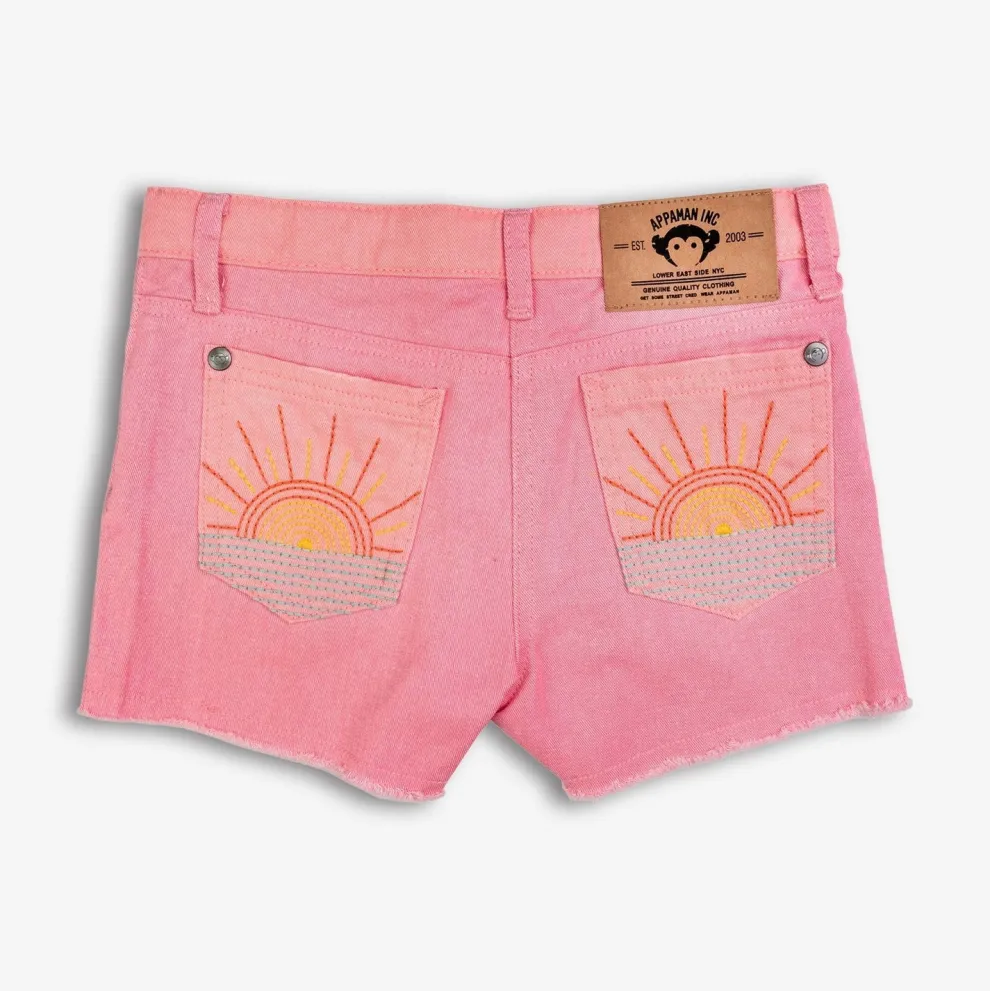 Made from a stretchy denim fabric, these cotton-denim jean shorts will be your kids favorite new piece. Featuring a raw hem and stitched sunrise on the back pockets.