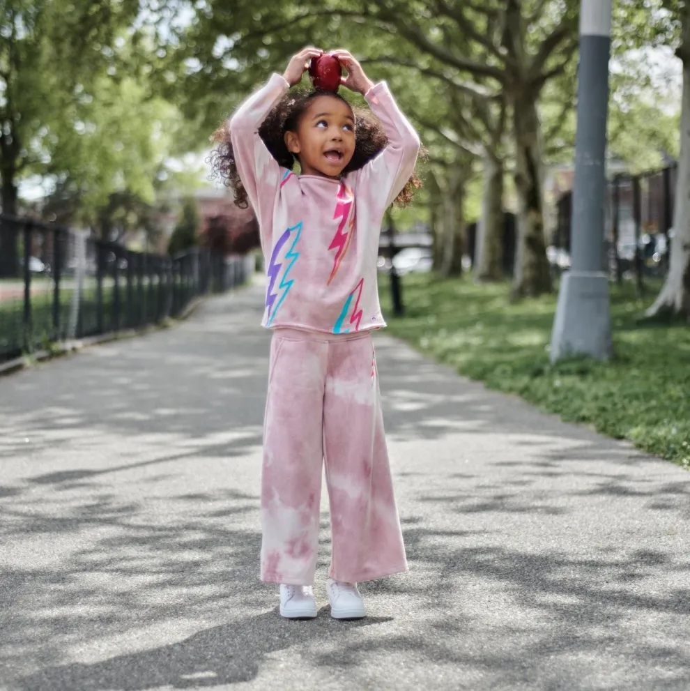 Flared sweats are in! Try our pale pink and white tie-dye flared Samantha Sweats in Pink Marble. The cute and comfy pair of sweatpants feature lightning bolt designs, pockets to store treasures, and drawstrings for the perfect fit. Appaman always has you prepared with the newest trends. Pair it with our Slouchy Sweatshirt to complete the matching set!