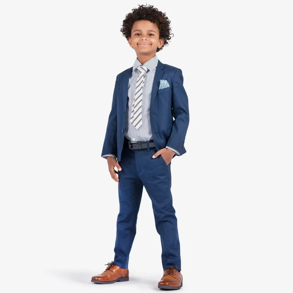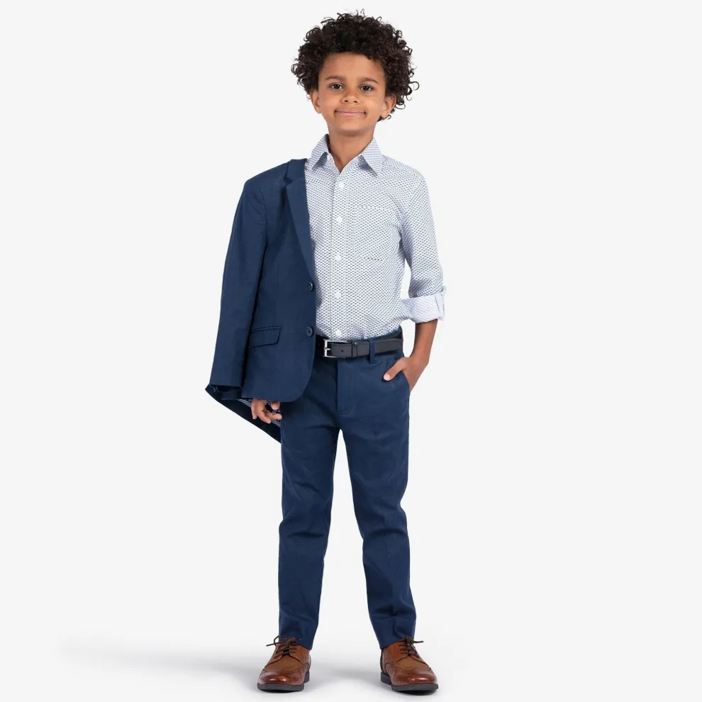 Our classic two-piece modern stretch linen blend suit features a notch-lapel blazer and adjustable waist and hem pants for your little one to wear as they grow! Bonus: It features an attached, contrast pocket square that can be popped out, or tucked in. Premium White Standard Shirt sold separate.