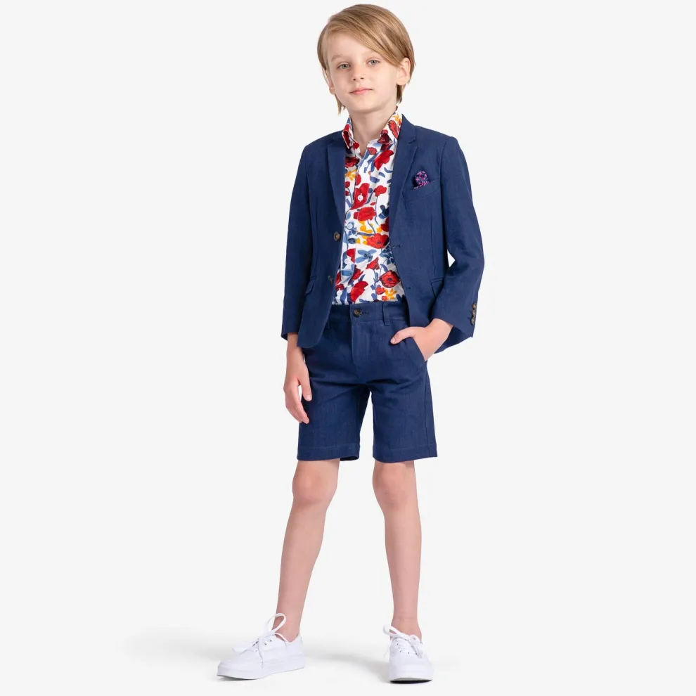 These flat-front trouser shorts crafted from 100% linen fabric, showcase a classic, navy fabric with dual slit pockets on the sides. Perfect for any Summertime Soiree. Pair with the a Dark Navy Suit Blazer.