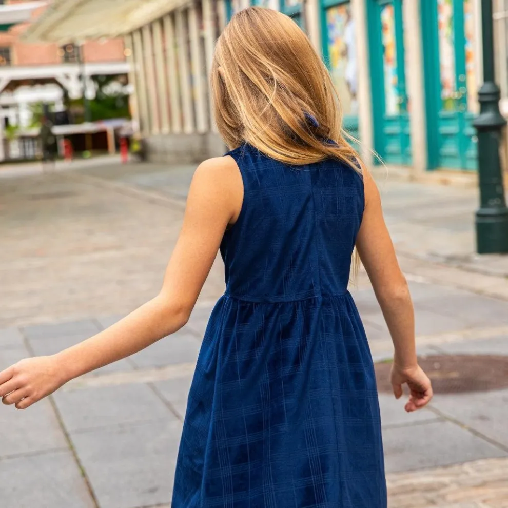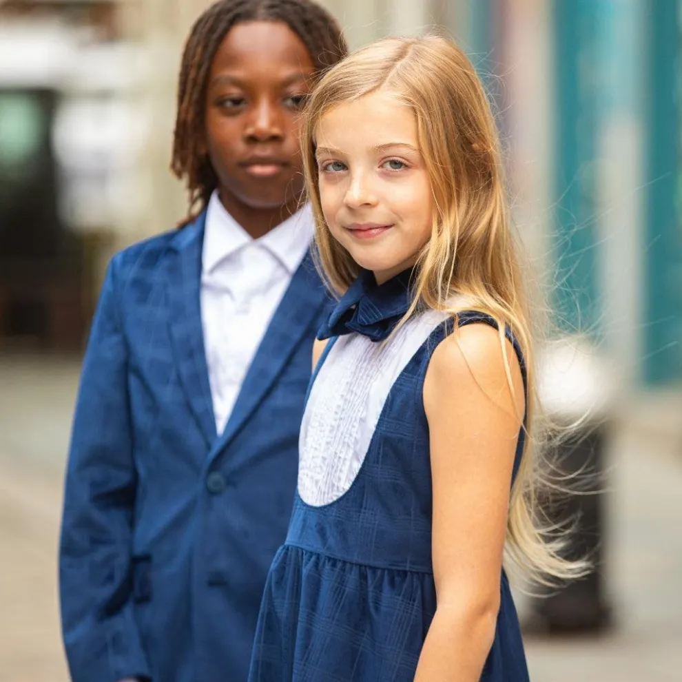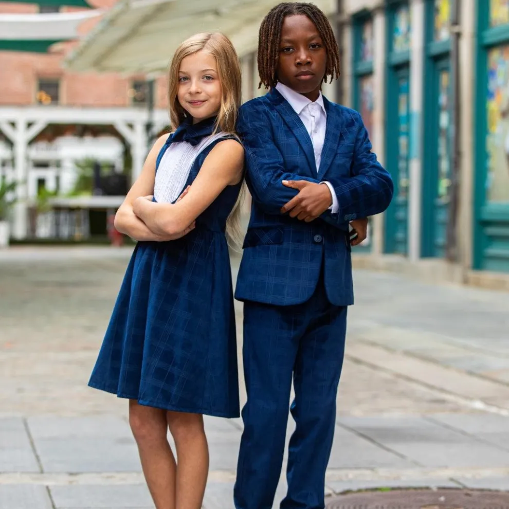 Our best selling tuxedo dress has returned in a web-exclusive, beautiful blue velvet windows pattern to coordinate with our boys’ tailored suit.