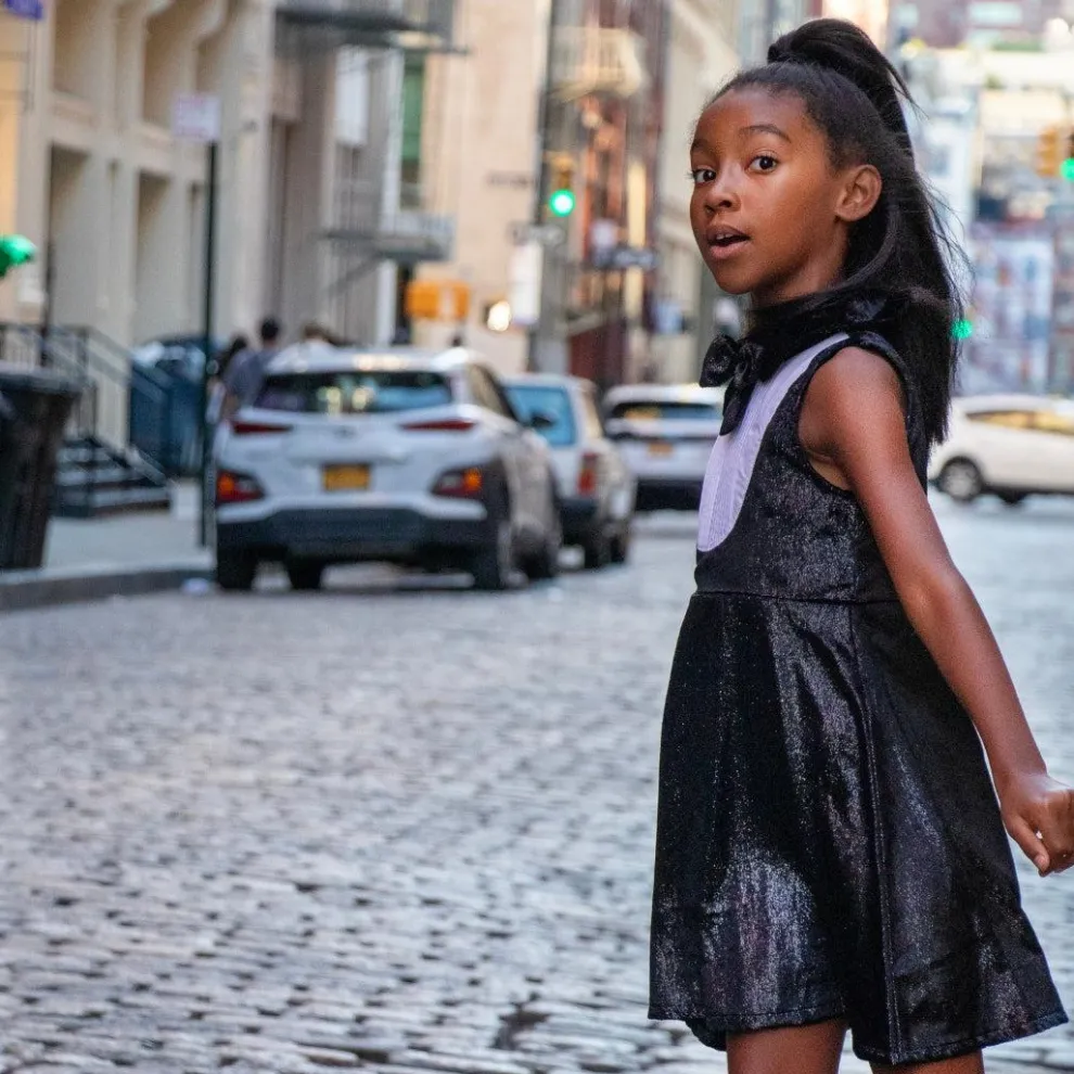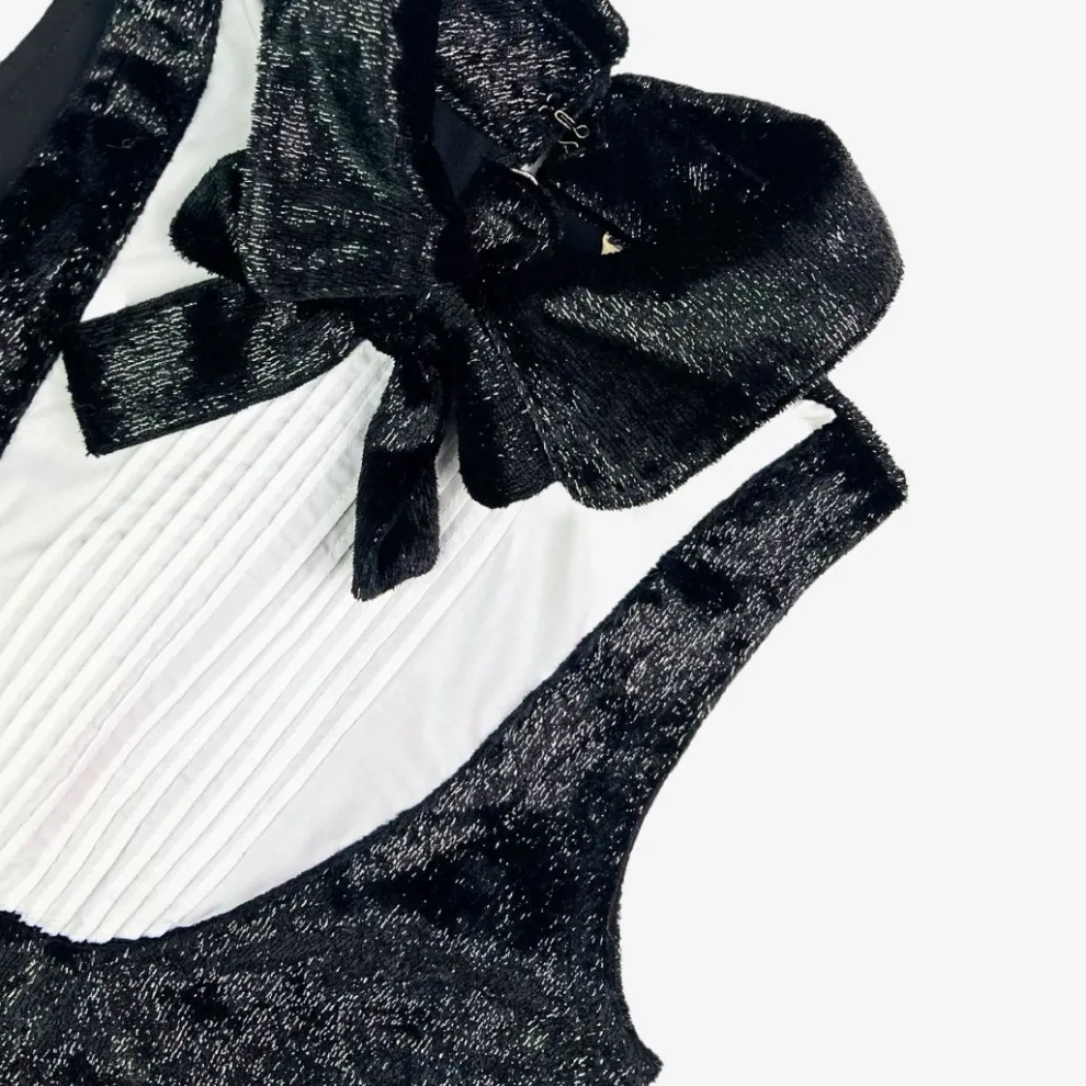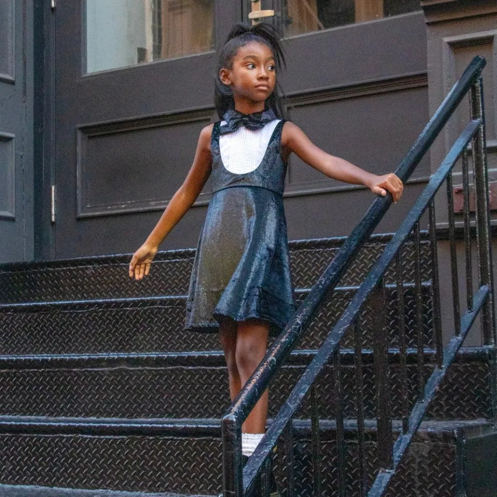 Who would’ve thought of a tuxedo combined with a dress? Us. This iconic velvet tank dress feautures a bib-front shirt with a velvet bow-tie collar. She will be rocking this tux dress with style!
